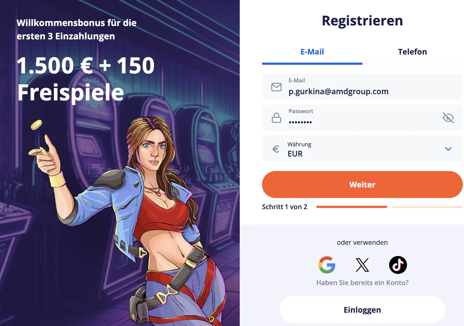 - Zugangsdaten festlegen: Wir geben unsere E-Mail-Adresse ein und erstellen ein sicheres Passwort. Diese Daten benötigen wir später für jede Anmeldung bei Vulkan Vegas online.